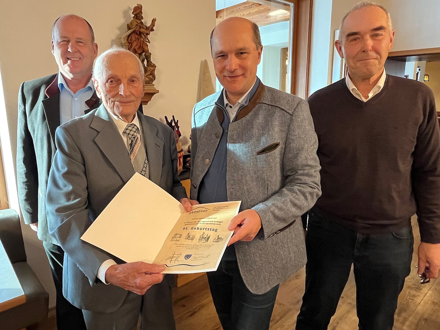 Auf die Frage, wie man so alt wird, antwortet Herr Naderer spontan: „I hob imma g’orbeit!“ Die Zufriedenheit, Bescheidenheit und das Fleißigsein könnten Eigenschaften sein, die ein langes Leben garantieren – geht man nach der Philosophie des Jubilars. Unser Obmann durfte ihm zu seinem Geburtstag die Glückwünsche überbringen und konnte sich selbst überzeugen: Naderer Johann ist körperlich und geistig fit für seine 95 Jahre! Wir wünschen ihm alles Gute und Gesundheit für das neue Lebensjahr! Foto v.l.n.r. Vzbgm. Josef Frühwirth, Johann Naderer, Bgm. DI Hannes Pressl, Senioren Obmann Josef Deutenhauser
