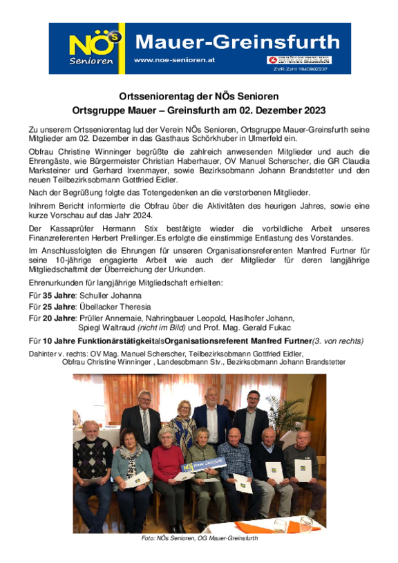 Die Ortsgruppe Mauer besteht aus 6 Ortsteilen: Mauer, Waldheim, Winkling, Pilsing, Greinsfurth und Spiegelsberg und besteht derzeit aus 150 Mitgliedern.