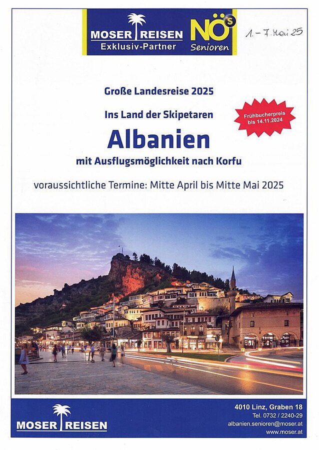 Bei einem Reiseeinführungsvortrag im GH Berndl in Krenstetten, lernten wir die Besonderheiten der Großen Landesreise 2025 nach Albanien kennen. Der voraussichtliche Reisetermin für unseren Bezirk wird vom 1. - 7. Mai 2025 sein. Frühbucherbonus bis 14.11.2024.